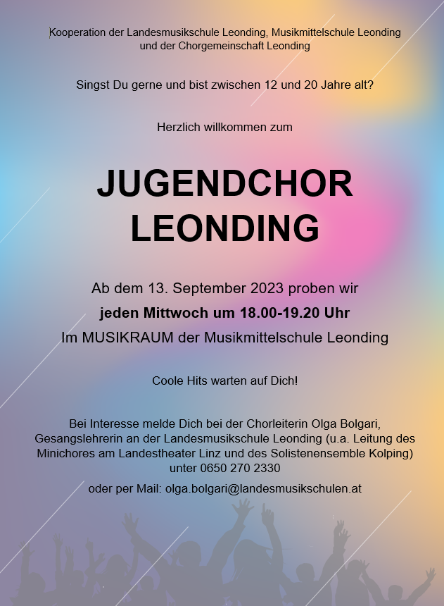 Seit diesem Schuljahr 2023/2024 hat der Jugendchor seine Reise begonnen, initiiert durch Wolfgang Furtmüller, den Obmann der Chorgemeinschaft Leonding, unterstützt von Martina Prinz, Direktorin der Musikmittelschule (MMS) Leonding, und Gerhard Reischl, Direktor der Landesmusikschule (LMS) Leonding.