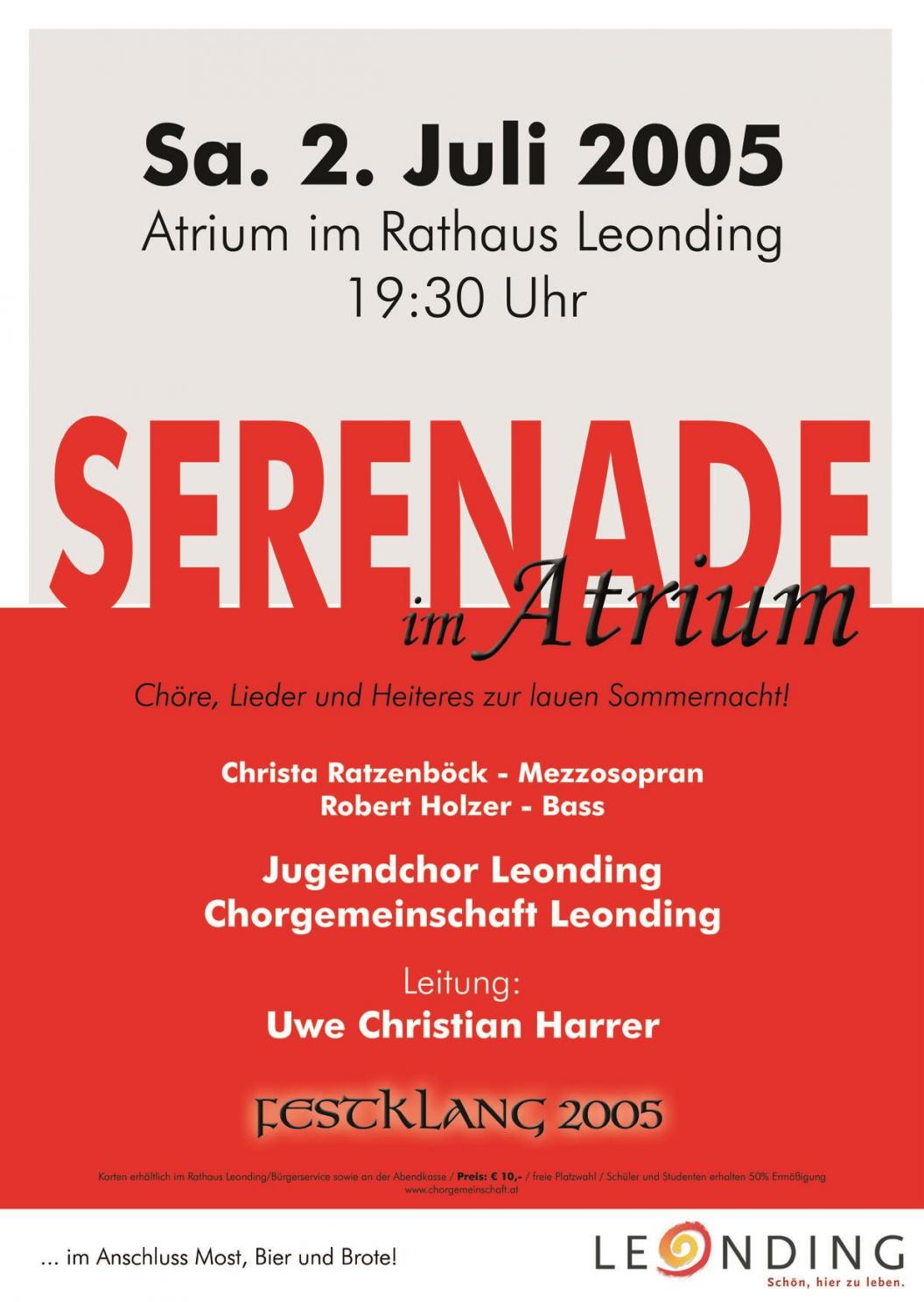 2. Juli 2005: Diesmal wurde bei einer Serenade im Atrium des Rathauses Leonding von Chorgemeinschaft und Jugendchor ein abwechslungsreiches Programm geboten, zu dem überdies die Solisten Christa Ratzenböck (Mezzosopran) und Robert Holzer (Bass) mit Liedern von Franz Schubert, Johannes Brahms und Richard Strauss beitrugen. Ein Sketch über Methoden des „Gesangsunterrichts“, köstlich vorgetragen von Hans Pichler und Wolfgang Furtmüller, sorgte für viel Heiterkeit.